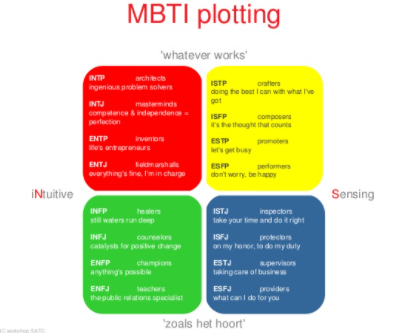 - Stap 1: S vs N – hoe neem je het liefst informatie op (sensing of intuition), hoe denk je? Abstract, intuïtief en gericht op het grote idee achter de dingen of eerder observatief en concreet.