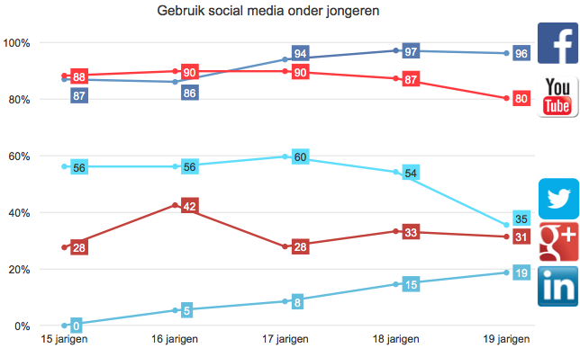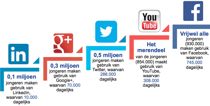 Facebook wordt door vrijwel iedereen gebruikt (ongeacht het opleidingsniveau): van de 993.000 Nederlanders van 15 tot en met 19 jaar gebruiken er 930.000 Facbeook, waarvan 745.000 dagelijks.