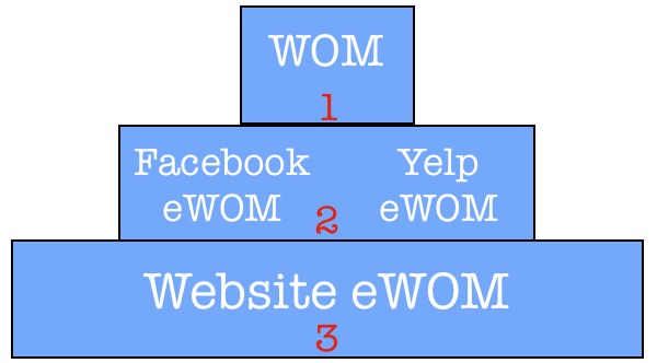 Je zou verwachten dat het effect van eWOM via Facebook hoger zou zijn dan dat van een aanbeveling via Yelp. De kracht van WOM is sterk omdat je de mensen om je heen vertrouwt. En op jouw FB zitten toch ook mensen die je (goed) kent in tegenstelling tot de mensen op sites als Yelp. Grappig genoeg bleek dit echter niets uit te maken. De aanbevelingen via Yelp werden als net zo sterk ervaren als de eWOM via FB. Het aantal eWOM aanbevelingen bleek overigens ook niets uit te maken. Het is dus niet zo dat meer aanbevelingen grotere effecten tot gevolg hebben.