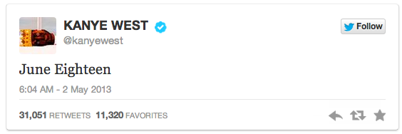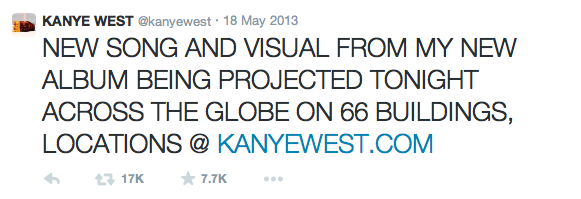 Het is 2013 en er is altijd buzz en hype rondom Kanye West. Een grote promotiecampagne is niet nodig. Met 10,7 miljoen volgers op Twitter ís de rapper/producer zijn promotiecampagne. Op 1 mei 2013 verschijnt de tweet “June Eighteen“, op 17 mei gevolgd door de release van het nummer ‘New Slaves‘, die die dag op 66 publieke locaties wereldwijd wordt geprojecteerd.