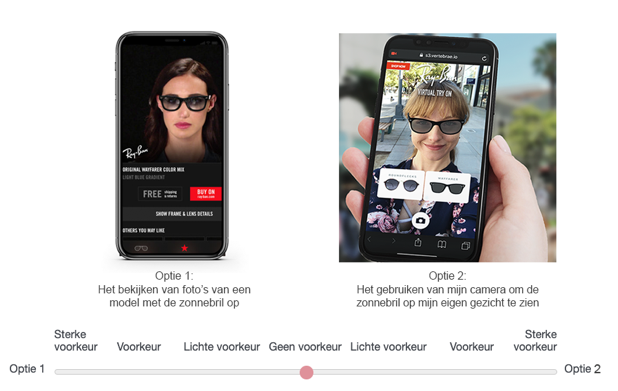 Elke deelnemer kreeg per app een voorbeeld te zien van een app en werd gevraagd in hoeverre zij voorkeur hadden voor de AR- of de non-AR-variant (zie het voorbeeld hieronder). Dit werd uitgevraagd voor vijf verschillende type apps: