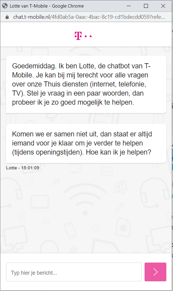 Afbeelding 1: De chatbot van T-Mobile geeft aan het begin van het gesprek aan dat klanten met een medewerker kunnen spreken als de chatbot de vraag niet kan beantwoorden.