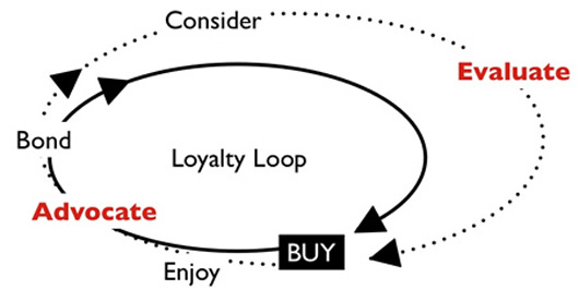 De percentages verschillen per onderzoek, maar het komt er toch telkens op neer dat tegenwoordig méér dan de helft van de koopprocessen (ja ook B2B) op internet plaatsvinden, en daar ook beginnen. Toen onze lead een leadje was geldt dus niet langer: tegen de tijd dat ze contact met je opnemen weten ze al méér van jouw productcategorie dan de gemiddelde verkoper in je bedrijf. Wie neemt er dan de ‘lead’? Enerzijds betekent dit dat je met ‘inbound marketing’ moet zorgen dat je bij Google gevonden wordt, maar anderzijds betekent het iets heel belangrijks voor de ‘sales trechter’: die klopt niet langer. In de Harvard Business Review verscheen enige tijd terug een interessant artikel, waarin de ‘sales trechter’ ten grave wordt gedragen. In het model (zie afbeelding) wordt benadrukt dat je klanten door een ‘cirkel’ gaan voordat ze (opnieuw) bij jou kopen, en dat ze aan de andere kant van deze cirkel misschien geen lead zijn, maar wel degelijk van groot belang kunnen zijn (bijvoorbeeld als ambassadeur).