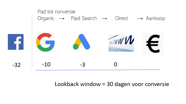 Attributie is gebaseerd op een aantal aannames en instellingen. Eén daarvan is de lookback window en een ander is de post-view/post-click window. De lookback window is de hoeveelheid dagen vanaf een conversie dat je terug gaat kijken om het pad tot conversie te bepalen. Dit is iets wat je (bijvoorbeeld binnen Google Analytics-attributie) zelf kan instellen en wat afhankelijk van jouw markt misschien juist lang of juist kort moet zijn. Heb je snel terugkerende klanten, dan kun je een korte window kiezen. Heb je een markt waarbij mensen niet zo vaak terugkeren dan zou je een langer lookback window kunnen hanteren.