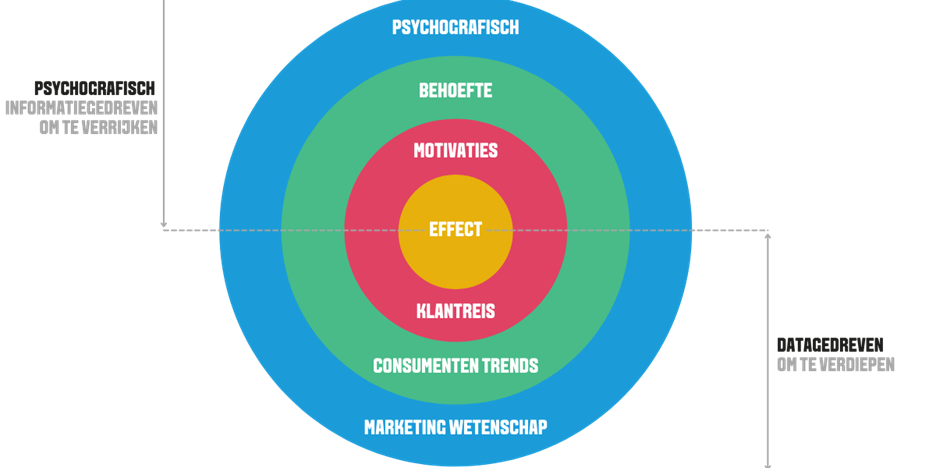 - De bovenzijde van het model toont de psychografisch gedreven invalshoek en kijkt naar inzichten die gedrag/actie voorspellen en anticiperend werken. Deze kant richt zich op de hoe-vraag.