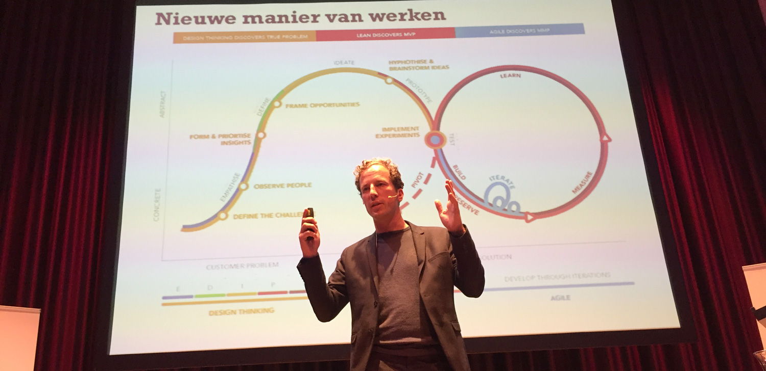 Die gedachte leidde ING ertoe om niet meer in de traditionele silo’s te werken, maar in multidisciplinaire “tribes, guilds, chapters & squads”, “the spotify way of working“. Daarnaast werd een andere methodologie toegepast, gebaseerd op design thinking, lean startup en agile & scrum. Ervaren managers werken perfect voor bestaande business, vanuit intuïtie. Maar bij innovatie werkt dat juist tegen. Want als je aannames maakt over hoe mensen werken, heb je een probleem.
