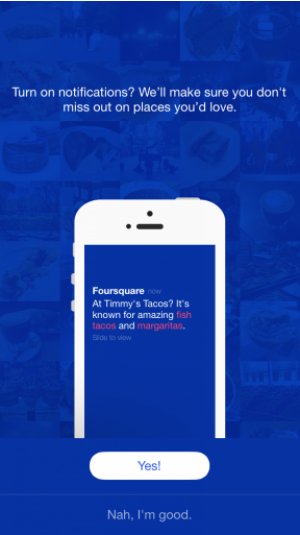 Als een gebruiker Foursquare voor het eerst opent, verschijnt er een melding waarin wordt uitgelegd dat zijn locatie gebruikt zal worden. Daarbij wordt uitgelegd dat deze informatie gebruikt zal worden om hen notificaties te sturen, ook als de app niet geopend is. Er staat ook bij dat gegevens niet met derden worden gedeeld.