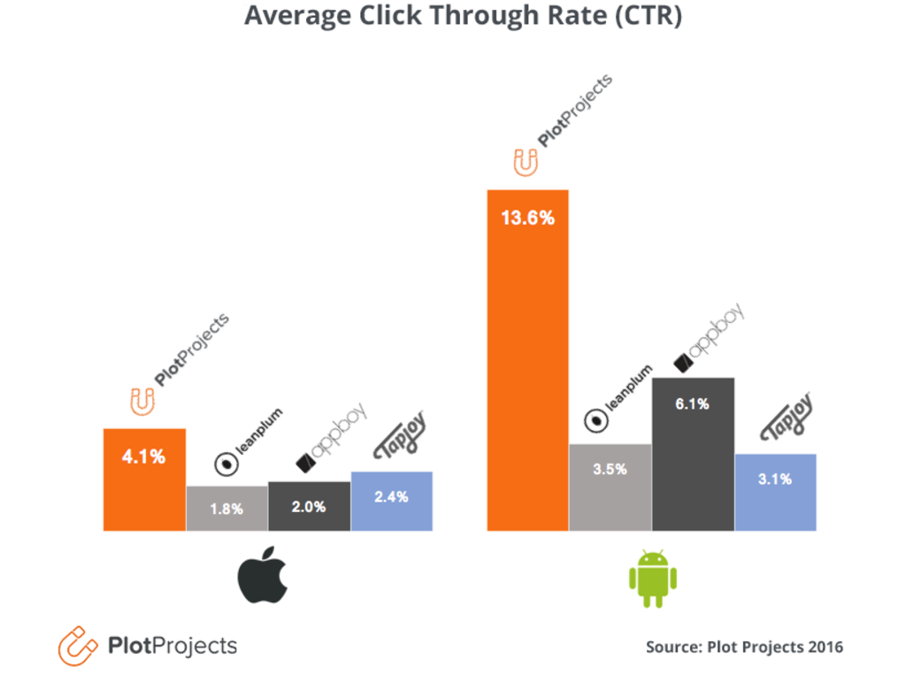 Door te kijken naar de data van Plot Projects’ klanten, kunnen we deze vraag beantwoorden. Al deze klanten gebruiken location-based marketing met onze plugin. We vergelijken de gemiddelde click-through-rate (CTR) van hun notificaties met die van drie specialisten in segmentatie. We gebruiken daarbij, naast onze data over heel 2016, de data van Leanplum, appboy and Tapjoy.