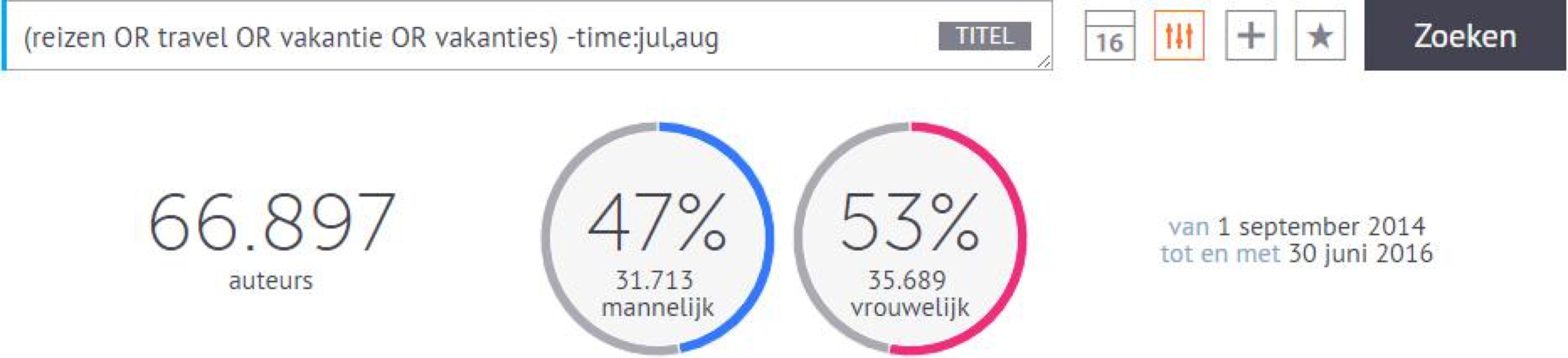 Een voorbeeld: je bent een reisbureau en wilt weten wie zich ook buiten de vakanties met reizen bezighoudt. Met socialmedia-monitoringtools bouw je eenvoudig een zoekopdracht op basis van het onderwerp en de tijdsperiode. Omdat je op zoek bent naar mensen en niet naar onder andere bedrijven en websites, zoek je bovendien enkel naar berichten van auteurs die herkend worden als man of vrouw.