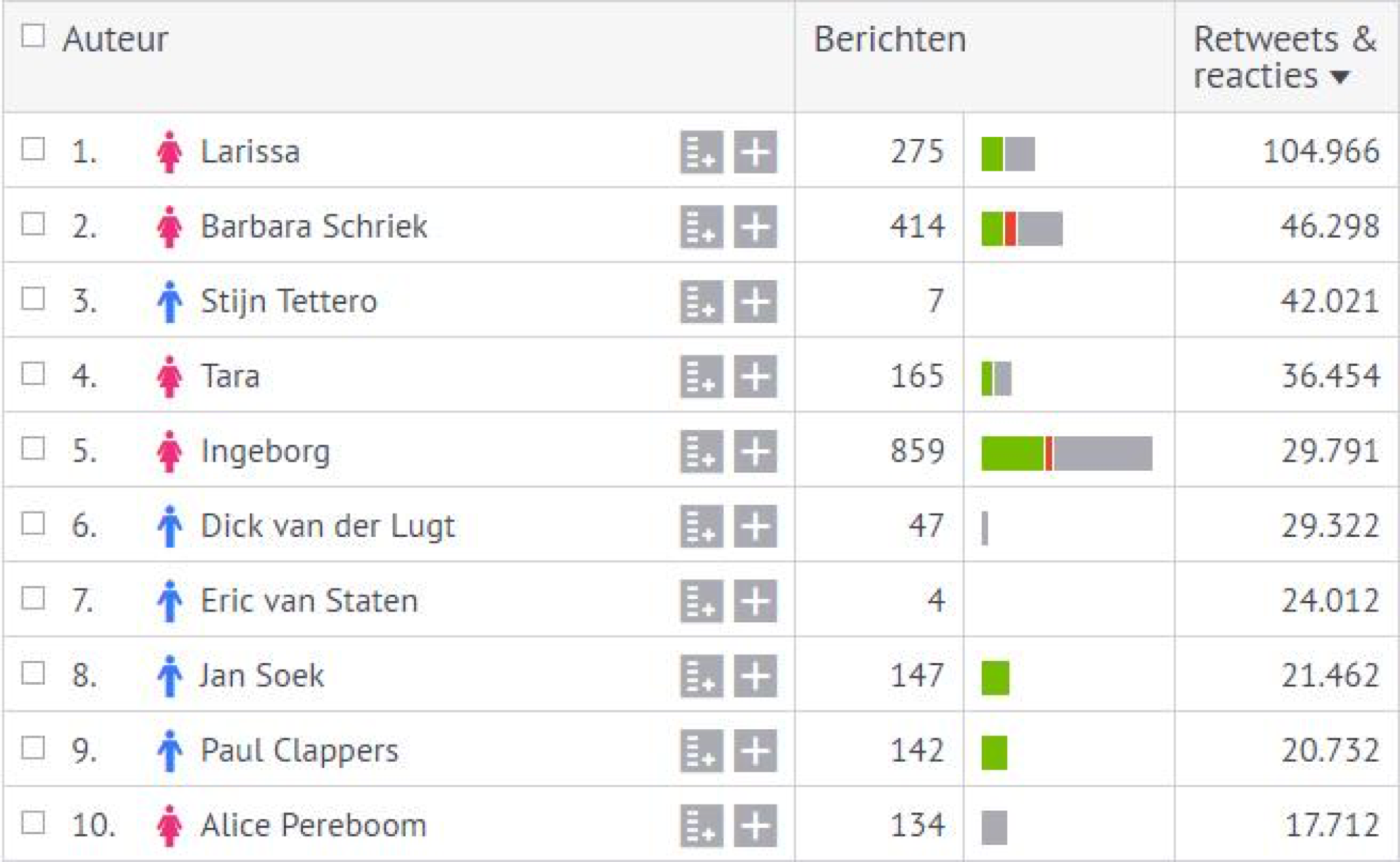 Bij het voorbeeld van het reisbureau zijn blogs een belangrijke bron. Door blogs als type platform toe te voegen aan de zoekopdracht, vind je 47.702 bloggende auteurs, die te sorteren zijn op het aantal retweets en reacties. Auteurs waarvan jij weet dat deze goed in jou doelgroep passen omdat deze zichtbaar overeenkomsten tonen met de eigenschappen die in jou persona beschreven zijn.