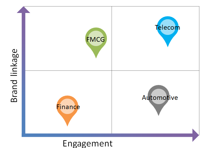 Een voorbeeld van een sector waar het andersom werkt – wel veel aandacht, maar in mindere mate hoge merkkoppeling – is de automotive-sector. Deze sector is meer high interest, heeft genoeg te vertellen over technologische ontwikkelingen en weet dit vaak in een mooi jasje te steken. Op gebied van merkkoppeling is er nog wel ruimte voor verbetering.