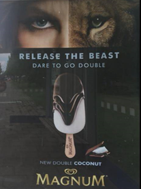 Deze uiting van Magnum weet goed de aandacht te trekken en te behouden. Ook wordt de aandacht goed naar beneden gestuurd, waardoor de meerderheid de boodschap koppelt aan het merk.