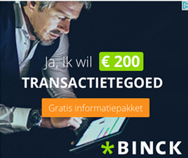 Bij Binck is het gezicht op de foto alleen te zien vanaf de zijkant, en de visual geeft niet de mogelijkheid in de ogen te kijken. Hoewel de persoon naar beneden kijkt, wordt de aandacht onvoldoende naar beneden gestuurd. De uiting komt gesloten over, ook door de donkere achtergrond.