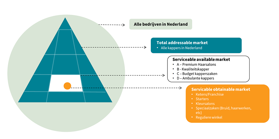 Stel, je bent een leverancier van kappersartikelen. Dan zouden alle kappers in Nederland jouw product of dienst in potentie kunnen kopen. In Nederland zijn zo’n 30.000 kappers gevestigd. Die 30.000 kappers vormen jouw total addressable market. Binnen je assortiment heb je verschillende producten in verschillende kwaliteitsstandaarden: van basic tot premium. Iedere kapper deel je op in een segment dat bij die producten past. Dan kom je uit op 4 groepen bedrijven binnen je serviceable available market: