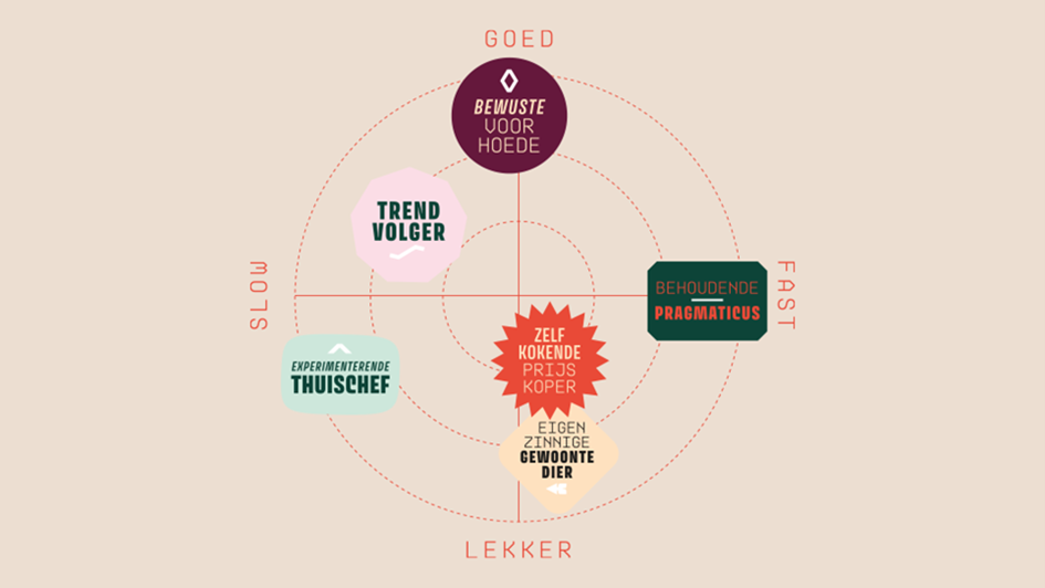 Het onderstaande plaatje geeft de zes profiles weer op twee assen. De horizontale as geeft aan hoeveel tijd, geld en moeite de consument bereid is te investeren in zijn of haar eten. Helemaal links vinden we de Experimenterende Thuischef (14% van de Nederlanders), die gaat voor kwalitatief genieten. Zijn tegenpool is de Behoudende Pragmaticus (22%), die zich vooral laat leiden door betaalbaarheid en gemak.