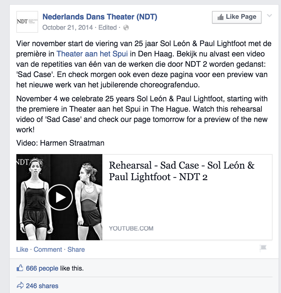 Het lukt het Theater aan het Spui om het hele jaar door bereik en betrokkenheid te creëren. Zoals vaker zijn de uitschieters in het bereik vaak de off-topic berichten. Een voorbeeld hiervan was een Iers danseresje dat in het theater moest optreden, maar op weg daarheen haar jurkje kwijt was geraakt in de Randstadrail. De zoektocht werd online breed uitgezet en onder andere door Omroep West opgepakt. Dit laat zien dat de lokale betrokkenheid bij het theater groot is: zijn berichten worden meteen opgepakt en binnen Den Haag gedeeld.