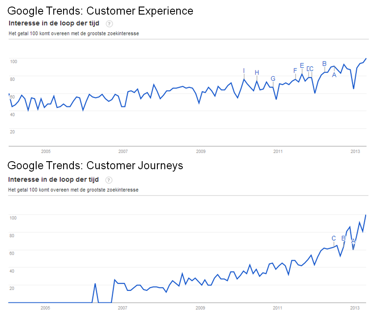 Een veel toegepaste methode om de customer experience te verbeteren is customer journey mapping. Ook de interesse in customer journeys is de laatste jaren fors toegenomen, getuige wederom Google Trends. De customer journey is de ‘reis’ die je als klant maakt om uiteindelijk een product of dienst te kopen en te gebruiken; met eventueel een verlenging van het gebruik of de aanschaf van een nieuwe product. Ieder product of dienst heeft zijn eigen customer journey. Binnen de verschillende stadia van de journey heeft een klant behoeften (I want…, I need…) en ondergaat de klant een bepaalde customer experience (klantbeleving/klantervaring).