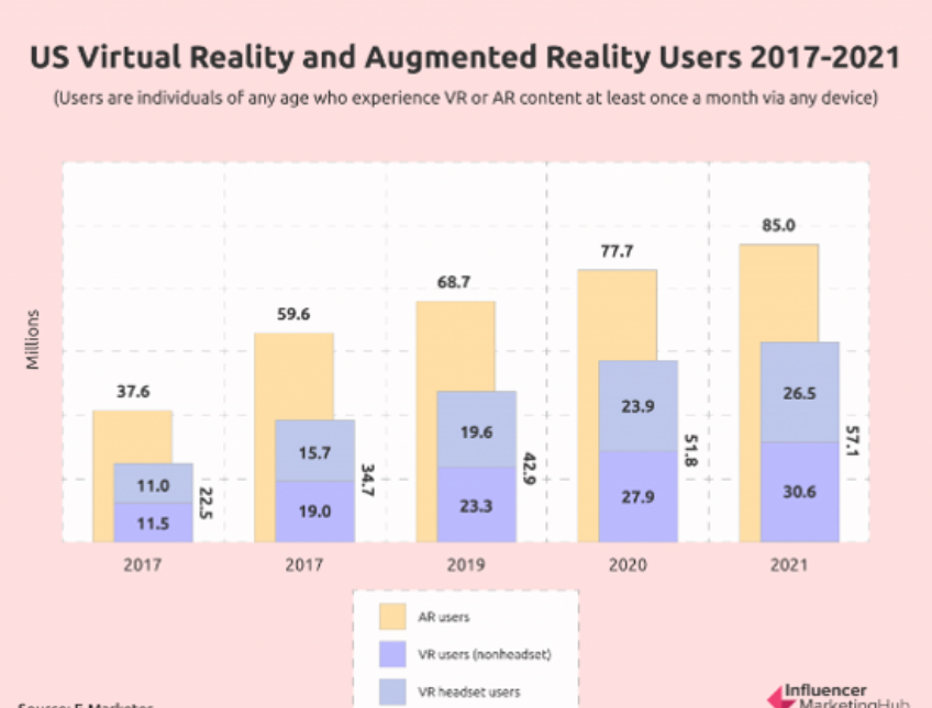 Er zijn al optimistische voorbeelden van het potentiële publiek dat je zou kunnen bereiken: in 2019 woonden 10,7 miljoen mensen Marshmello’s Fortnite-concert bij. Op dat moment dachten we dat dat enorm veel was. Maar ongeveer een jaar later bereikte het Fortnite-evenement van Travis Scott maar liefst 45,8 miljoen mensen. En zoals je ziet blijft het aantal VR- en AR-gebruikers (in de VS) gestaag groeien: