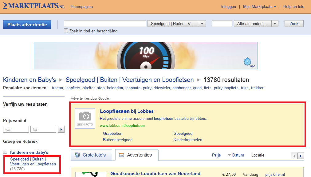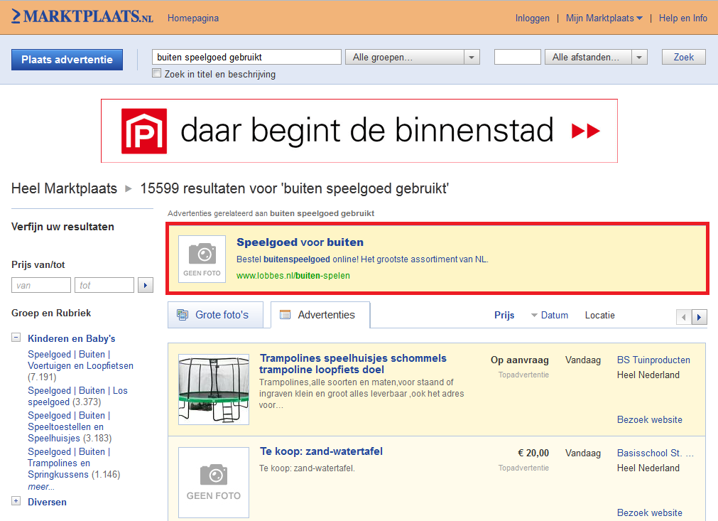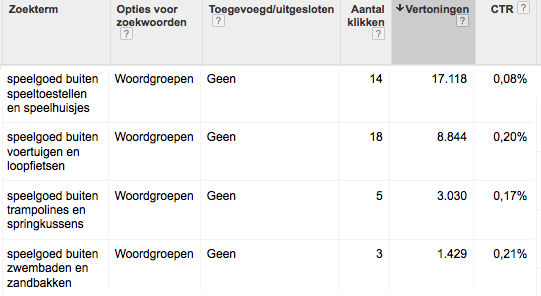Een voorbeeld: In mijn search campagnes voor speelgoedwinkel lobbes.nl, krijg ik op de zoekterm 'buiten speelgoed' meer dan 25.000 vertoningen. Deze ontstaan uit ‘zoekopdrachten’ die toevalligerwijs precies overeenkomen met de namen van de categorieën op Marktplaats: