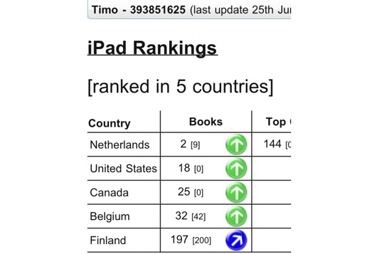 En het werkte! Met een grote website deden we een price-off actie voor 1 dag. De iPhone versie voor $ 0,99 en Timo stond zomaar op de 16e plaats in de categorie boeken van de US App Store! We voelden ons als de Shocking Blue van de Nederlandse app scene. De Golden Earring van het digitale uitgeven in Nederland. Zestiende! En we begonnen nog maar net. Opgewonden hielden we de verkoopcijfers in de gaten na afloop van de price-off. Op welke plek zouden we staan nu we de gewone prijs weer hanteerden? De dag na de actie stonden we 35e; nog een dag erna rond de 70e plaats en enkele dagen later stonden we weer lager dan de 100e plaats.