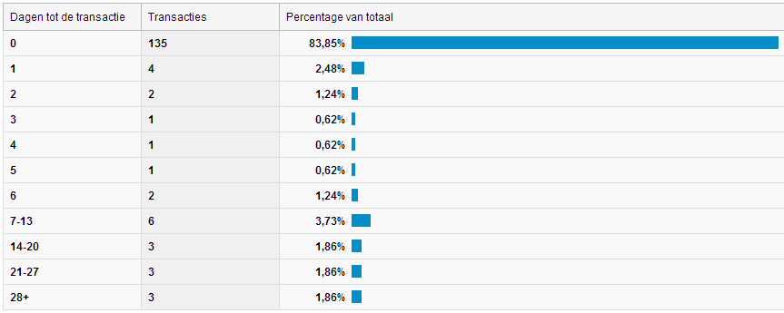 Om te onderzoeken in welke mate remarketing interessant is, kijk je naar de volledige online customer life cycle. In hoeveel dagen converteert de gemiddelde klant na het eerste bezoek? Dit is bijvoorbeeld snel te zien via Google Analytics. Hiervoor kijk je bij het tabblad E-commerce / Tijd tot aankoop. In onderstaand voorbeeld wordt 83,85 procent van de transacties op de eerste dag voltooid. Dat betekent dat er ook een meer oriënterende doelgroep is, die later tot aanschaf over gaat (16,15 procent). Door middel van remarketing ben je in staat om bij deze doelgroep onder de aandacht te blijven na het verlaten van de website; en dus ook het aantal transacties te vergroten.