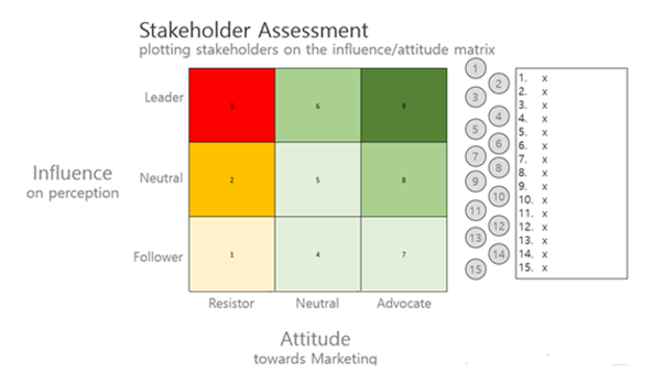 Probeer daarnaast – samen met jouw afdeling – een Stakeholder Matrix te maken – waar zitten jouw vrienden binnen de organisatie en waar moet je een tandje gaan bijzetten. Let er met name op wie invloed heeft op beslissingen en hoe ze jouw rol of functie waarderen. Dan weet je ook meteen waar je aan de relatie moet gaan werken.