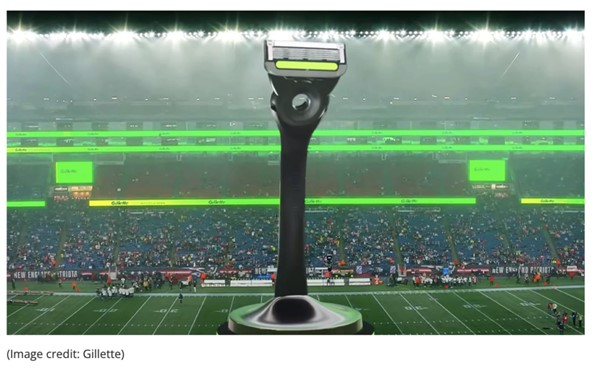 Tijdens ESPN’s uitzending van de wedstrijd tussen de New England Patriots en Chicago Bears, zagen fans hoe het Gillette Stadium veranderde in GilletteLabs Stadium. Vervolgens kwam er een laserstraal uit de toren die een, bijna Egyptisch goddelijke beeld, opbouwde van een Giant Razor. Het is leuk dat er mooie nieuwe technieken zijn om opvallende verhaaltjes te vertellen. Maar als het gaat worden zoals Gillette nu heeft laten zien dan hebben we een serieus probleem.