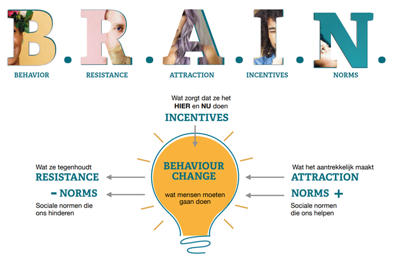 Uitgangspunt van B.R.A.I.N. Creatives is, dat gedrag (Behavior change) ontstaat door weerstand (Resistance), aantrekkingskracht (Attraction), prikkels (Incentives) en normen (Norms):
