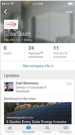 “Tenslotte krijg je inzicht op welk moment je je door wie kunt laten introduceren (vertrouwen). Met de functie ‘Team Link’ kun je contacten en profielen delen met collega’s binnen je bedrijf en gebruik maken van elkaars netwerk. Hiervoor hoef je niet persoonlijk gelinkt te zijn met elkaar, waardoor ook salesprofessionals die niet op eenzelfde locatie zitten, gebruik kunnen maken van elkaars netwerk”.