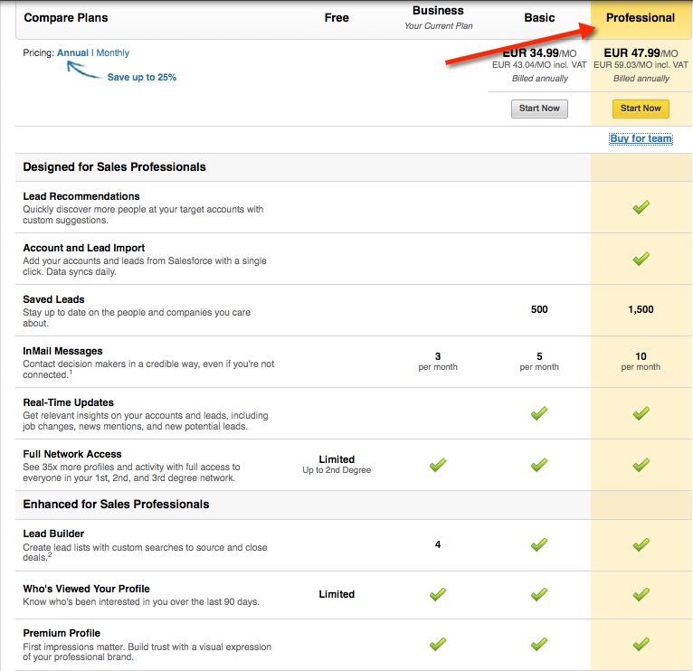In bovenstaande afbeelding zie je dat LinkedIn de ‘Lead Recommendations’ en ‘Account and Lead Import’ als onderscheidend vermogen ziet ten opzichte van de andere premium salestools. Toegegeven, de mogelijkheid om 1.500 contactpersonen te volgen biedt veel mogelijkheden, de 10 Inmails(*) per maand daarentegen geven je niet de slagkracht om deze te benaderen. En wil je meer Inmails, dan moet je bijbetalen.