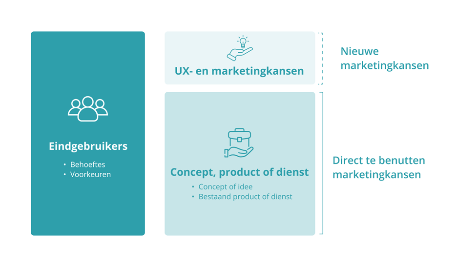 Zoals hierboven omschreven wordt UX-onderzoek enerzijds ingezet om beweegredenen, behoeftes en gebruikers te identificeren. Vervolgens kan worden onderzocht in hoeverre een concept, product of dienst hierop aansluit. Door deze inzichten naast elkaar te houden, kun je twee typen marketingkansen identificeren: