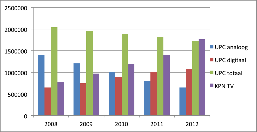 Aantal TV-abonnees (bron jaarcijfers Liberty Global; jaarcijfers KPN)