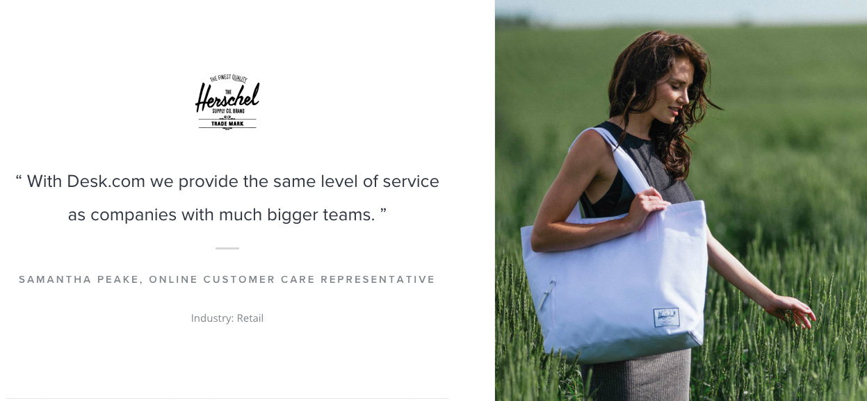 Een ander soort sociaal vertrouwen zien we bij getuigenissen van gebruikers en klantenwaarderingen. Zo heeft Desk.com een aparte pagina met testimonials. Positieve beoordelingen doen het vertrouwen in het merk stijgen.