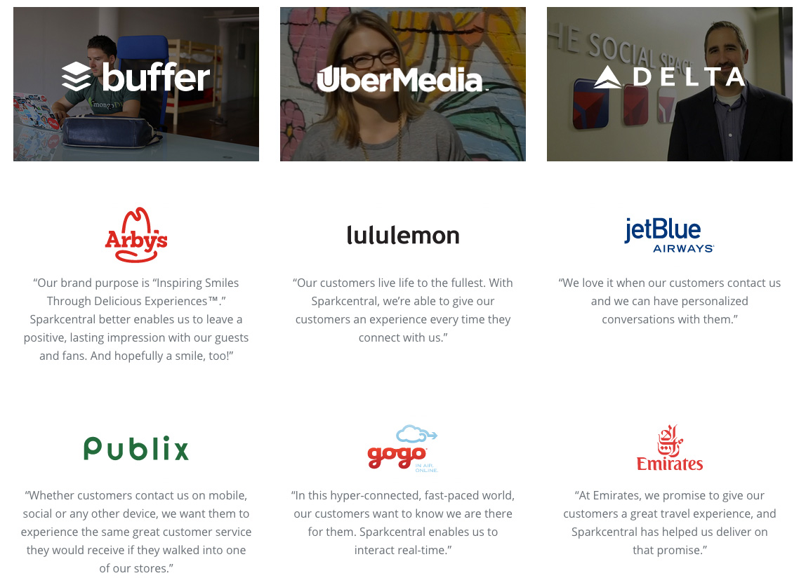 Ook erg krachtig is de vermelding van populaire merken die klant zijn of een product gebruiken. Neem bijvoorbeeld een kijkje naar de klantenpagina van Sparkcentral. Met zoveel wereldberoemde merken stijgt het vertrouwen in de kwaliteit van hun product.