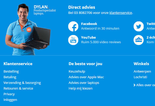 Daarnaast kan je foto’s van werknemers tonen. Een aparte pagina met foto’s is leuk, maar valt niet echt op. Er bestaan betere oplossingen. Denk maar aan Coolblue, die haar productexperts in de footer en video’s toont. Op deze manier geeft men een persoonlijke toets aan een webwinkel.