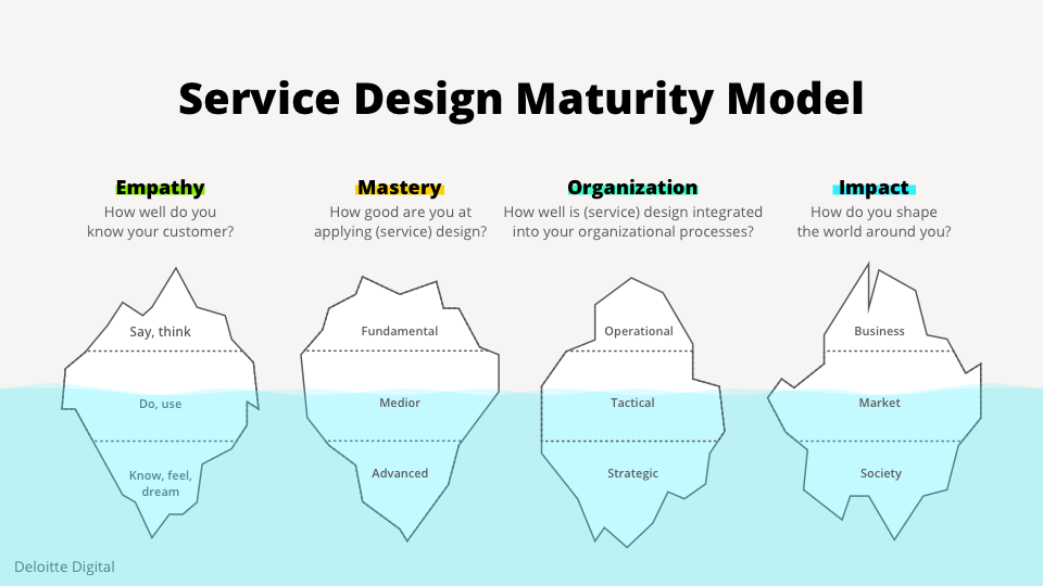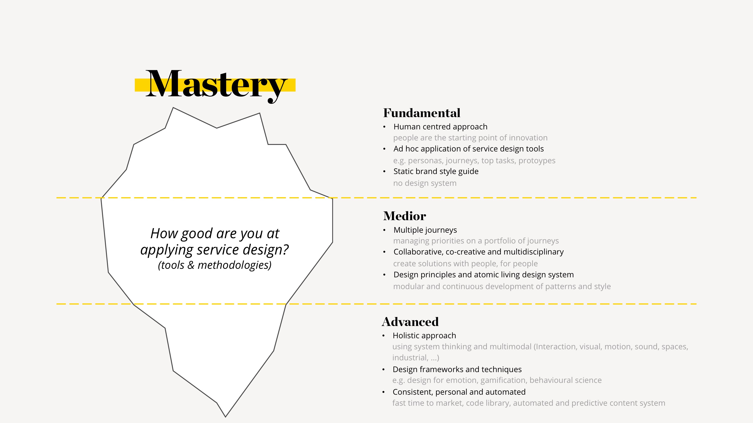 - Mastery: Hoe goed ben je als organisatie in het toepassen van service design (tools en technieken)?