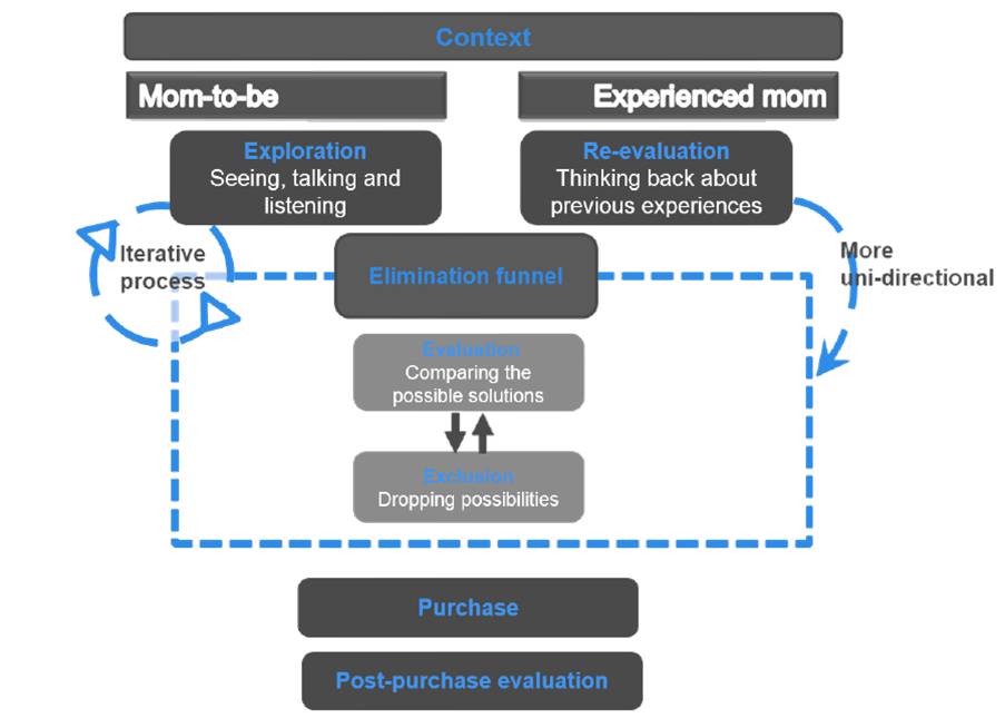 Volgens Koningen is het path-to-purchase een behoorlijk complex proces. “Ervaren en onervaren moeders gaan door hetzelfde proces. Maar voor onervaren moeders is het iteratief: zij verzamelen continu informatie, vergelijken, elimineren en vergelijken nóg een keer. Ze kijken niet alleen naar prijzen en functionele criteria, ze worden ook beïnvloed door context, emoties en hun omgeving.”