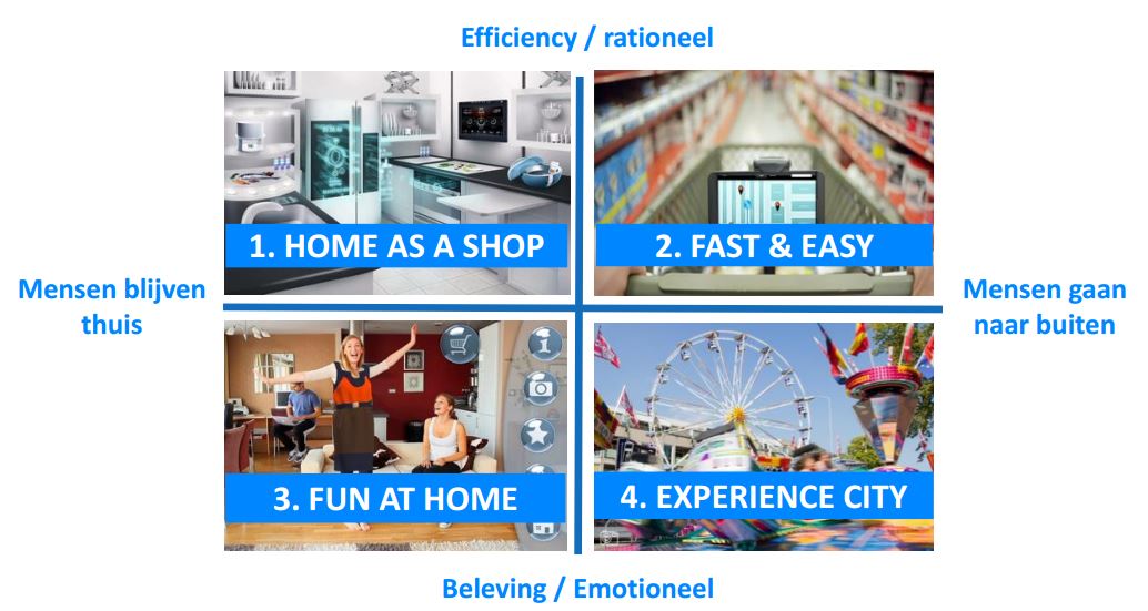 Bij twee scenario’s blijft de consument thuis en bij de andere twee scenario’s komt de consument of alleen nog in de stad om snel en efficiënt (fast & easy) iets te kopen óf voor de beleving (experience city). In beide gevallen moeten gemeenten en retailers flink aan de slag.