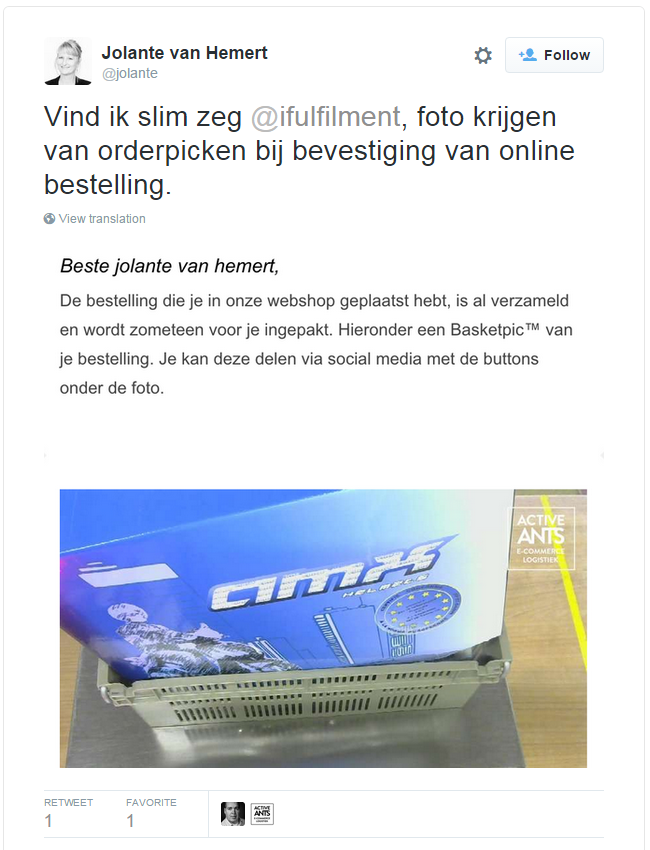 Waar ze ook al gebruik maken van de shareable experiental equity is bij Active Ants, een e-commerce fulfilment service voor webwinkels. In plaats van de standaard track-and-delivery code, ontvangt de klant een foto (de basketpic) van de bestelde producten die gereed staan voor verzending. Jeroen Dekker, managing partner bij Active Ants, verwacht dat de logistieke keten in de toekomst steeds vaker wordt ingezet als marketingtool.