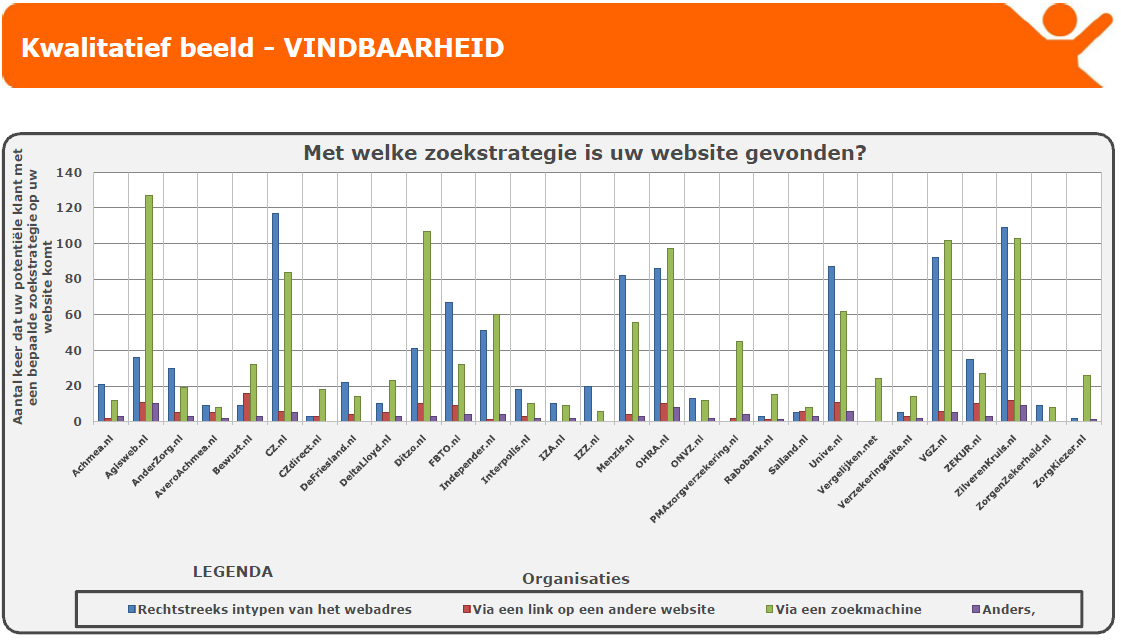 De aanbieders die in de top-3 staan van dit onderzoek (Zilveren Kruis op 1, CZ op 2 en VGZ op 3) hebben als overeenkomst dat ze allemaal goed scoren op het thema vindbaarheid. CZ en Zilveren Kruis zijn het vaakst via het ‘rechtstreeks intypen van het webadres’ gevonden. CZ.nl en ZilverenKruis.nl zijn ook de enige twee aanbieders die vaker via deze manier zijn gevonden dan via Google.