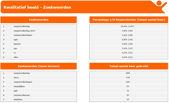 Uit onderstaande tabel blijkt duidelijk hoe een zoektocht naar een zorgverzekering anno 2012 begint. Van de 500 respondenten begint 29,4 procent (147) bij Google met de zoekterm “zorgverzekering”. Dat zal jullie niet verbazen; opvallend vind ik de posities 4, 5, 6, 7, 8. Die worden ingenomen door de merken, die kennelijk het meest fris in het geheugen liggen bij de onderzochte groep respondenten.
