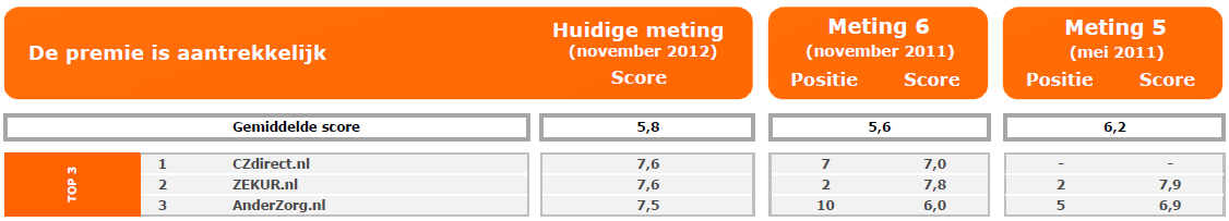 Nederlanders kiezen voor de laagste prijs, dat is een cliché dat wel wat nuancering kan gebruiken (zie ook deze blogpost: “10 best practices voor online vertrouwen”). Wat wel een aardig feitje is dat uit het onderzoek naar boven komt, is dat de top-3 van de bedrijven die als de meest aantrekkelijke wat betreft premie uit de bus zijn gekomen, allemaal dochterondernemingen zijn van grotere partijen. Zie bovenstaande tabel. Een van de respondenten zegt over AnderZorg: ‘Ken het niet, maar zie op de site dat het een partner van Menzis is.’