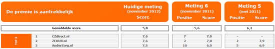 VGZ.nl is ten opzichte van vorig jaar gestegen van een achtste plek naar de derde plek en behaalde een Web Performance Score van 5,8. Een voor de hand liggende reden voor de stijging van VGZ.nl is de vindbaarheid. In november 2011 weet 25% van de respondenten VGZ.nl te vinden, in het onderzoek dat ik nu bespreek heeft 41% van de respondenten deze zorgverzekeraar gevonden tijdens het online oriëntatieproces.