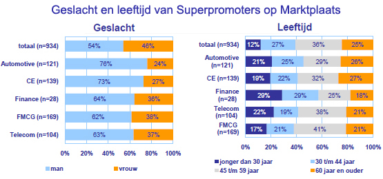In vergelijking met internettend Nederland en met eerdere onderzoeken van Blauw scoort Marktplaats hier sterk. Gemiddeld is in Nederland een op de vijf Nederlanders het menstype superpromoter, op Marktplaats is dat drie op de tien. Verder blijken Superpromoters op Marktplaats vaker man (54%) dan vrouw. Dit ligt boven het percentage mannen van de internettende bevolkingsgroep in Nederland (51,9% , comScore ). Vooral op het gebied van consumenten electronica en auto’s zijn er overwegend mannelijke Superpromoters (resp. 73% en 76%).