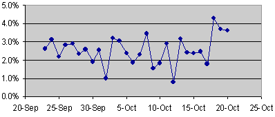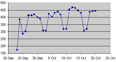 De eerste cijfers gaven al een redelijk beeld van het RSS-gebruik. Gedurende de eerste weken blijkt het aantal RSS-lezers wekelijks met ca. 5% toe te nemen tot inmiddels ruim 450 lezers per dag (werk-dagen). Dit is inmiddels 25% van het totale aantal lezers van dit weblog (let wel, dit zijn nog geen bezoeken).