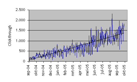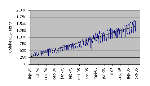Het aantal unieke RSS-lezers blijft gestaag toenemen en is inmiddels de 1.600 unieke RSS-lezers per dag gepasseerd (in de weekends daalt dit tot ca. 1.200 unieke RSS-lezers per dag). Ik ben benieuwd of de integratie van RSS in IE7 (nieuwe browser van Microsoft) straks een significante toename van het aantal RSS-lezers laat zien.