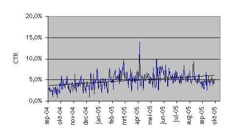 De gemiddelde click-through-rate (CTR) op de RSS-feeds lijkt zich te stabiliseren tot een gemiddelde van 5 tot 6 procent. Dit is het percentage van de RSS-lezers dat een RSS-feed van Marketingfacts te zien krijgt in een RSS-reader of aggregator en vervolgens doorklikt naar de website van Marketingfacts.
