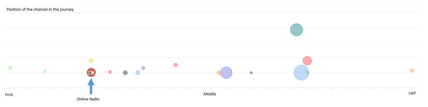 Als we kijken naar de positie in de customer journey, zit online radio voor deze verzekeraar op ongeveer dezelfde plek als socialmedia-advertising, display plain banners en textlink exchanges.