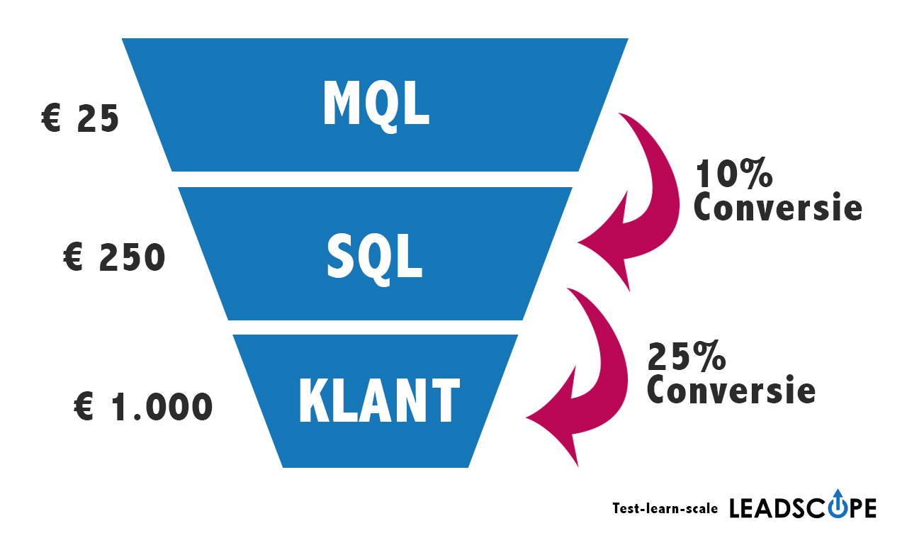 Stel: Je reserveert 1.000 euro aan marketingbudget voor een nieuwe klant. De gemiddelde conversie van een aanvraag voor een afspraak met een adviseur naar een daadwerkelijke klant is 25 procent. Dan mag het genereren van een nieuwe lead dus 250 euro kosten.