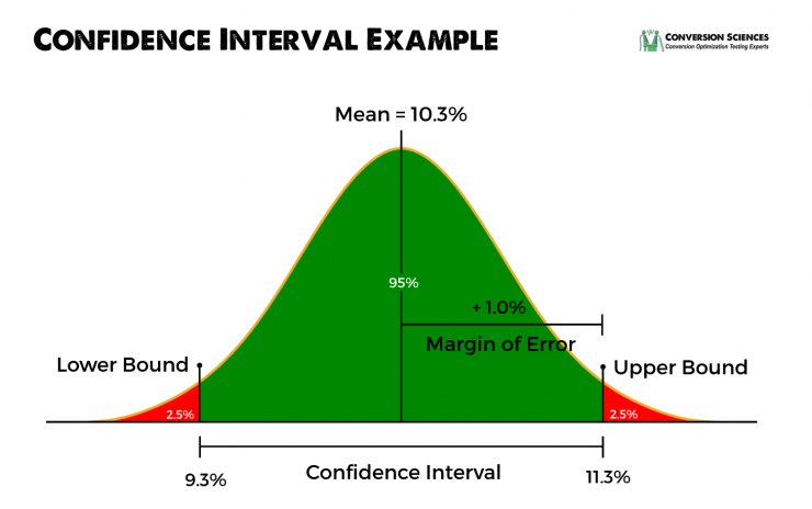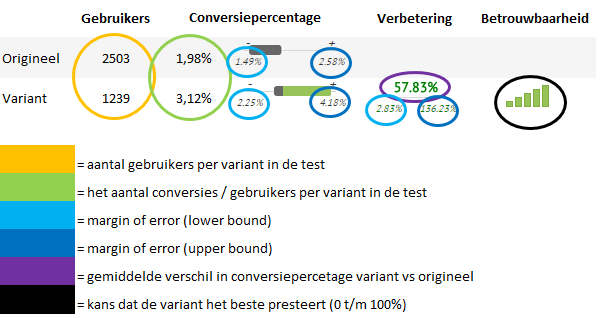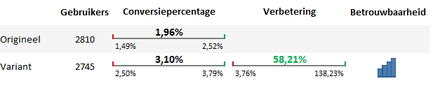 In onze rapportage maken we gebruik van intervallen van 95%, wat betekent dat er een 95% kans is dat het daadwerkelijke conversiepercentage tussen de onder- en bovengrens gaat vallen.